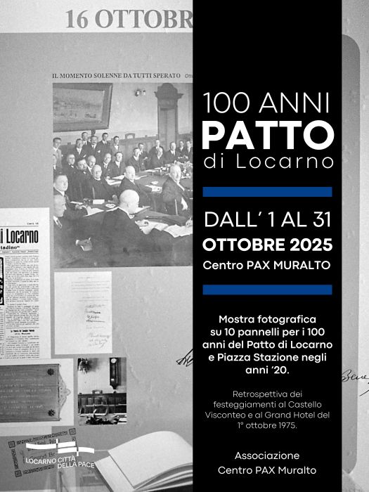 Nell’ambito dei numerosi eventi previsti per celebrare i cento anni del Patto di Locarno (accordi di Pace fra le diverse nazioni stipulati in Città nell’ottobre del 1925) rientra anche l’iniziativa dell’Associazione Centro Pax di Muralto. Per appunto sottolineare la ricorrenza l’Associazione promuove un’esposizione fotografica allestita nell’atrio del Palazzo Pax, situato in Via Stazione a Muralto. La mostra presenta una decina di scatti d’epoca – provenienti dagli archivi del fotografo Marco Garbani – corredati da brevi didascalie. Le immagini sono per lo più incentrate su vedute legate al quartiere della Stazione di Locarno-Muralto, luogo centrale dell’agglomerato locarnese. Nelle brevi didascalie che accompagnano le foto si è voluto privilegiare l’aspetto aneddotico, nel senso che l’accento è stato in particolare posto su delle piccole curiosità o degli aspetti marginali in rapporto al quadro storico dell’evento di Pace. L’esposizione verrà inaugurata il 1. Ottobre, e sarà visitabile per tutto il mese in qualsiasi giorno e orario dato che si svolge in uno spazio aperto. Quale appendice alla mostra da segnalare anche le fotografie (sempre provenienti dall’archivio Garbani) esposte nelle vetrine del Palazzo Pax e dedicate ai festeggiamenti organizzati per il 50. del Patto di Locarno nel 1975.