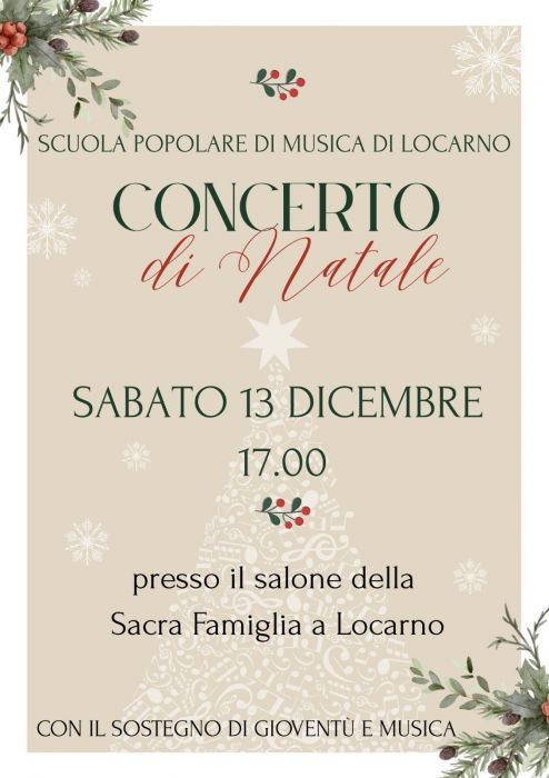 La Scuola Popolare di Musica di Locarno vi invita al Concerto di Natale, in programma sabato 13 dicembre alle ore 17.00, presso il salone della Sacra Famiglia a Locarno.