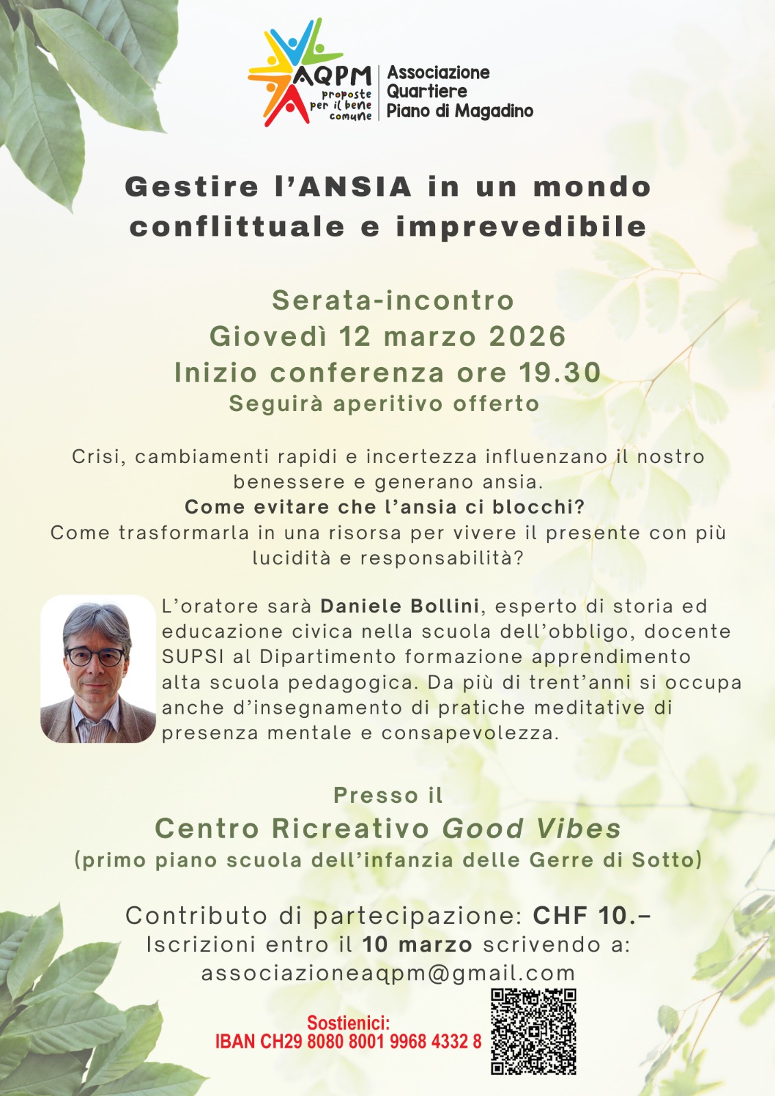 Il tema, dalle 19.30 al Centro Ricreativo Good Vibes (primo piano scuola dell'infanzia delle Gerre di Sotto), sarà affrontato da Daniele Bollini, esperto di storia ed educazione civica nella scuola dell'obbligo, docente SUPSI al Dipartimento formazione apprendimento dell'Alta scuola pedagogica. Da più di trent'anni si occupa anche d'insegnamento di pratiche meditative di presenza mentale e consapevolezza.