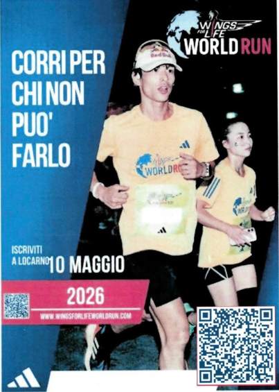 La Wings for Life World Run è una corsa unica nel suo genere e globale per tutti, sia runner che partecipanti in carrozzina. Invece del traguardo, i concorrenti corrono fianco a fianco per tenere testa alla Catcher Car virtuale. Il 10 maggio 2026 i partecipanti della Wings for Life World Run in Svizzera potranno anche correre insieme a Locarno.