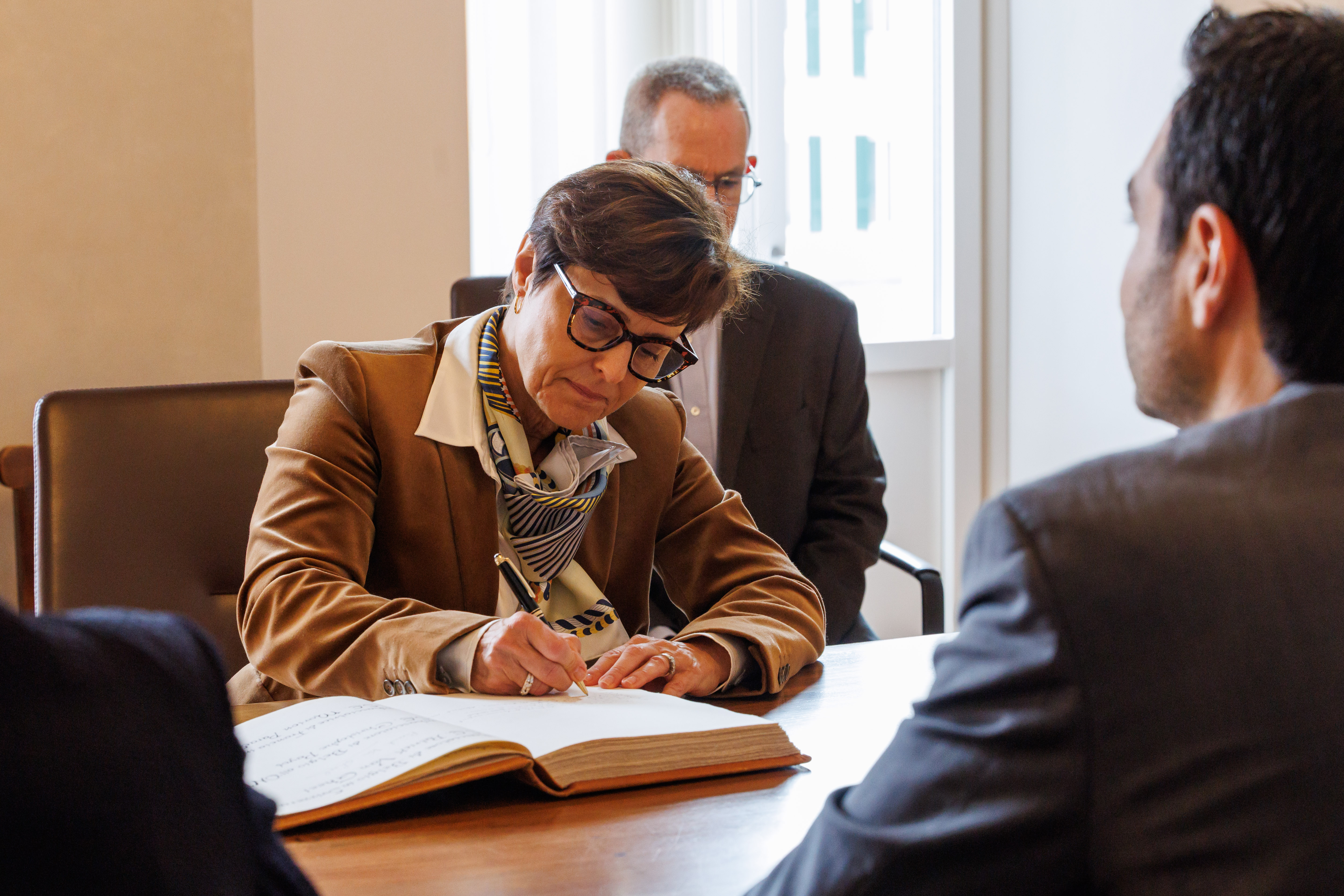 A conclusione della visita, l’Ambasciatrice Paradas ha potuto firmare il pregiato Libro d’oro della Città, lasciando un pensiero personale sull’attualità e l’importanza dei valori espressi nel Patto di Locarno, firmato cento anni fa, che ancora oggi rappresentano una fonte d’ispirazione nella ricerca di soluzioni pacifiche ai conflitti contemporanei.