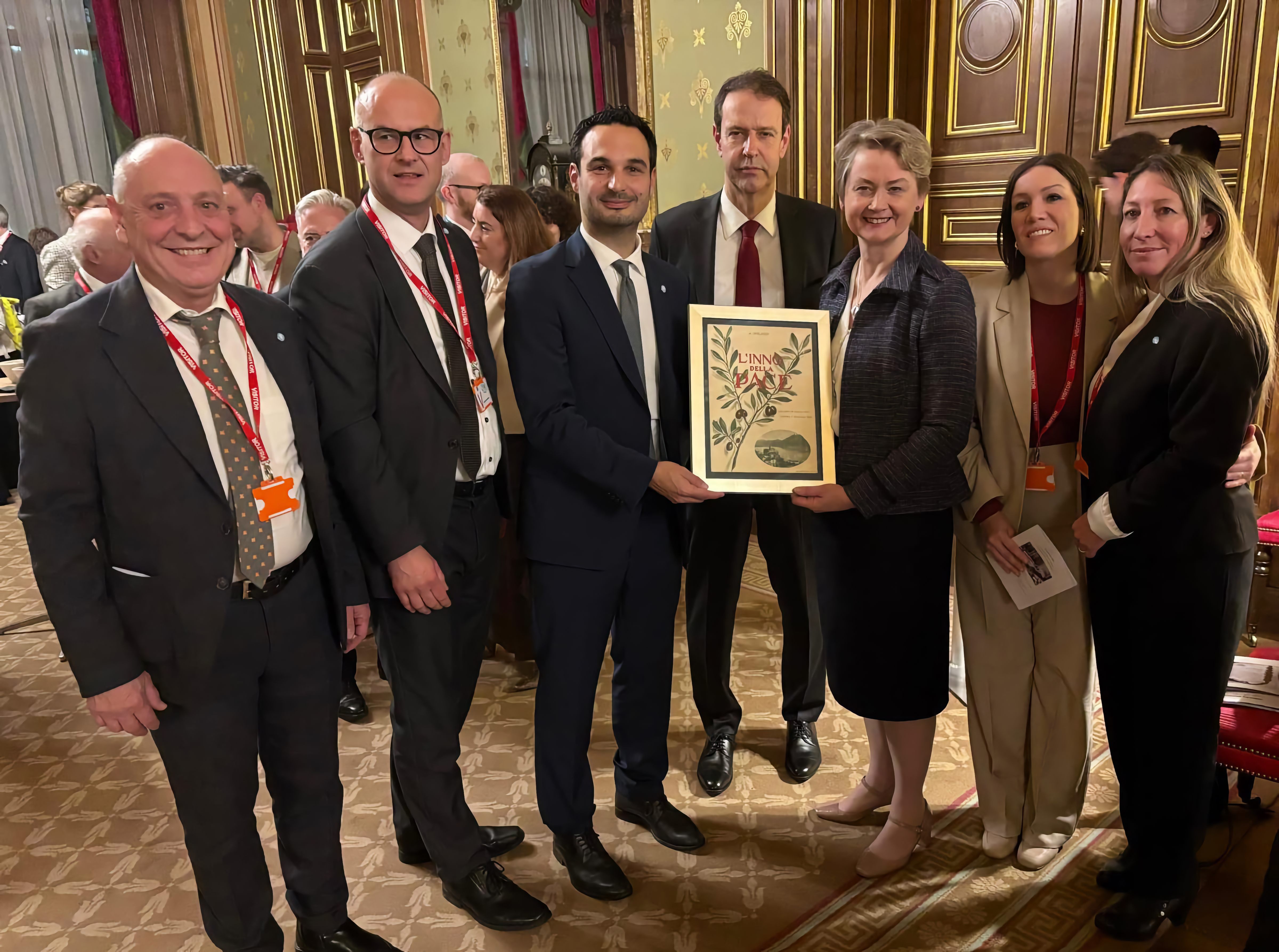 Durante il ricevimento istituzionale, il Sindaco di Locarno, Nicola Pini, ha ribadito il significato contemporaneo dell’Esprit de Locarno come approccio politico e civile: un invito permanente a scegliere la via del dialogo, del diritto, dell’arbitrato e della cooperazione invece che della pulsione alla forza. Nel suo intervento, Pini ha ricordato la figura di Giovan Battista Rusca, allora Sindaco di Locarno e protagonista storico dell’organizzazione della Conferenza del 1925, annunciando la donazione al FCDO di un suo busto in bronzo destinato alla Locarno Suite: un gesto simbolico per consolidare una memoria condivisa e riaffermare il ruolo che anche una città di dimensioni contenute può avere nel promuovere valori universali. In occasione della Cerimonia, il Sindaco Nicola Pini ha inoltre offerto al FCDO una copia originale dell’Inno della pace composto nel 1925 in occasione degli Accordi di Locarno.